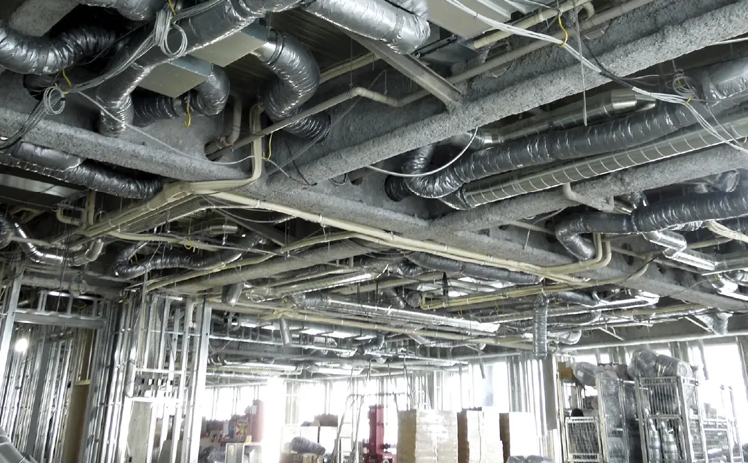 完成後には隠れてしまう、天井裏での空調配管施工の様子。